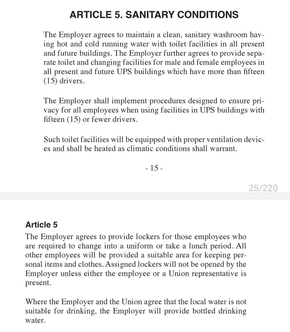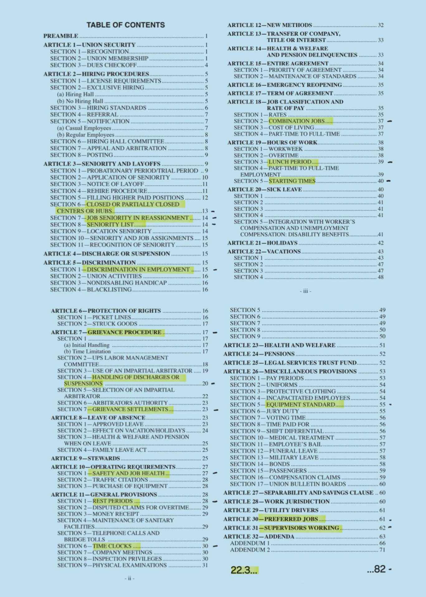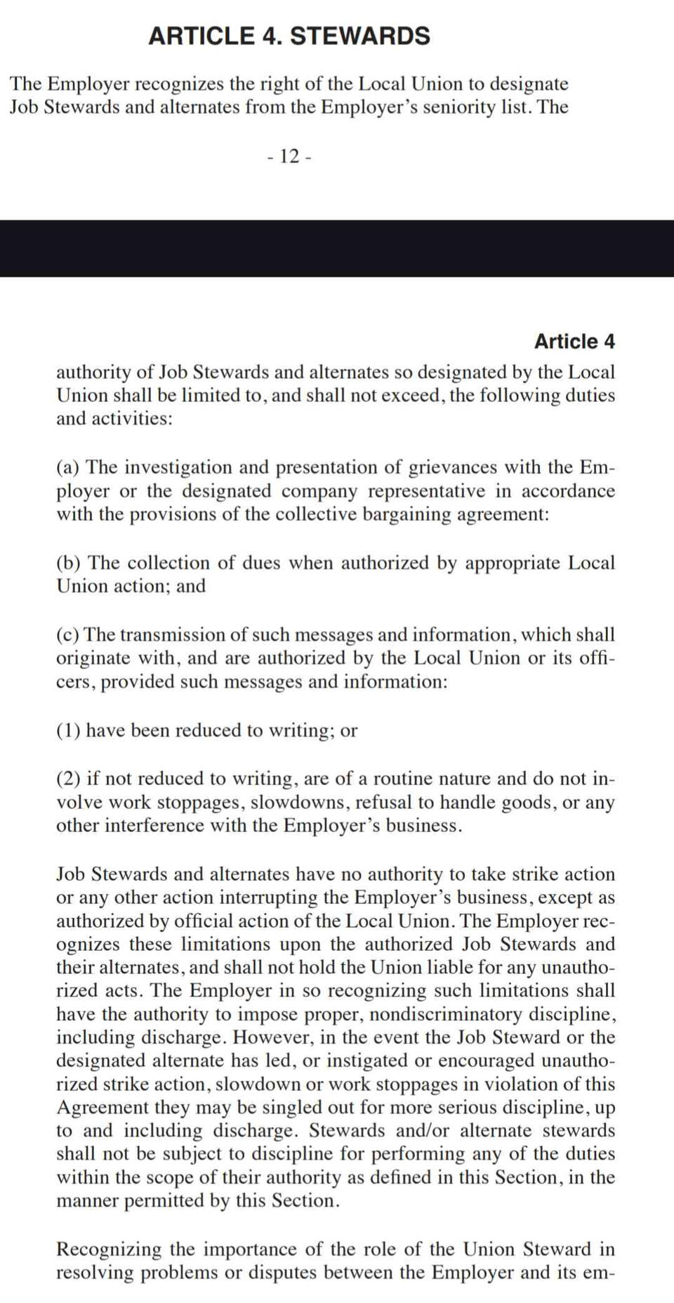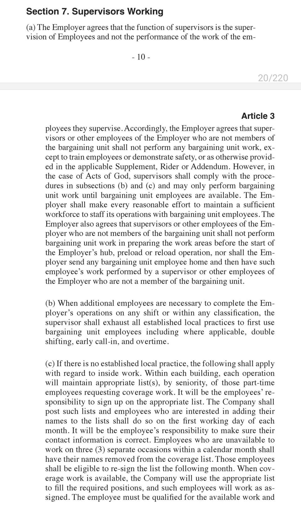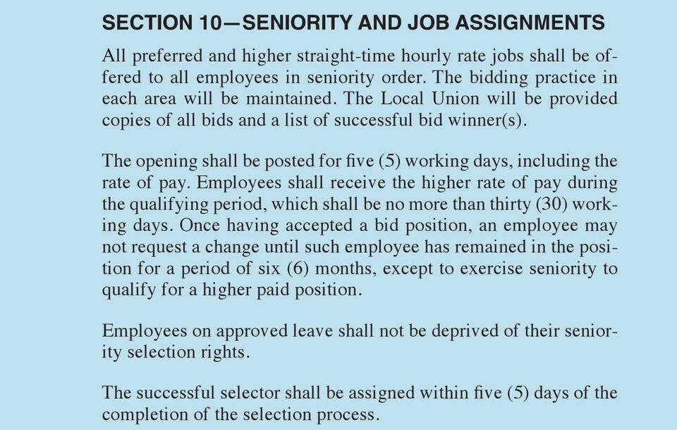 This section of the union agreement covers employee rights, seniority rules, grievance handling, workplace safety, job bidding, rest breaks, time clocks, and supervisor limitations. It outlines full-time work rules, wage progression, and overtime assignment while ensuring fair procedures for discipline, grievance resolution, and labor-management committee functions.