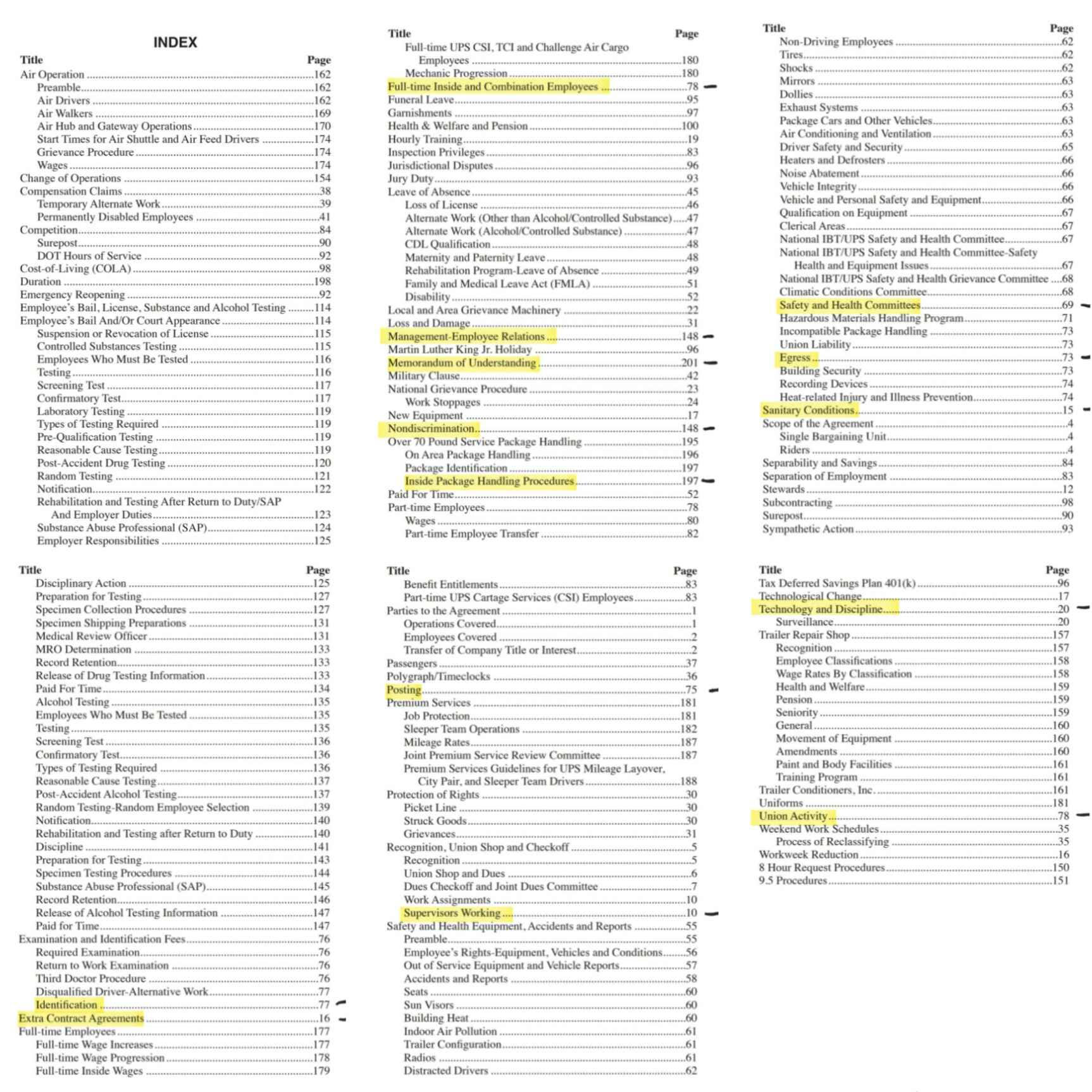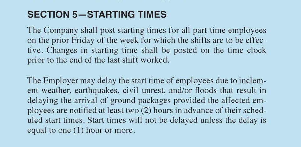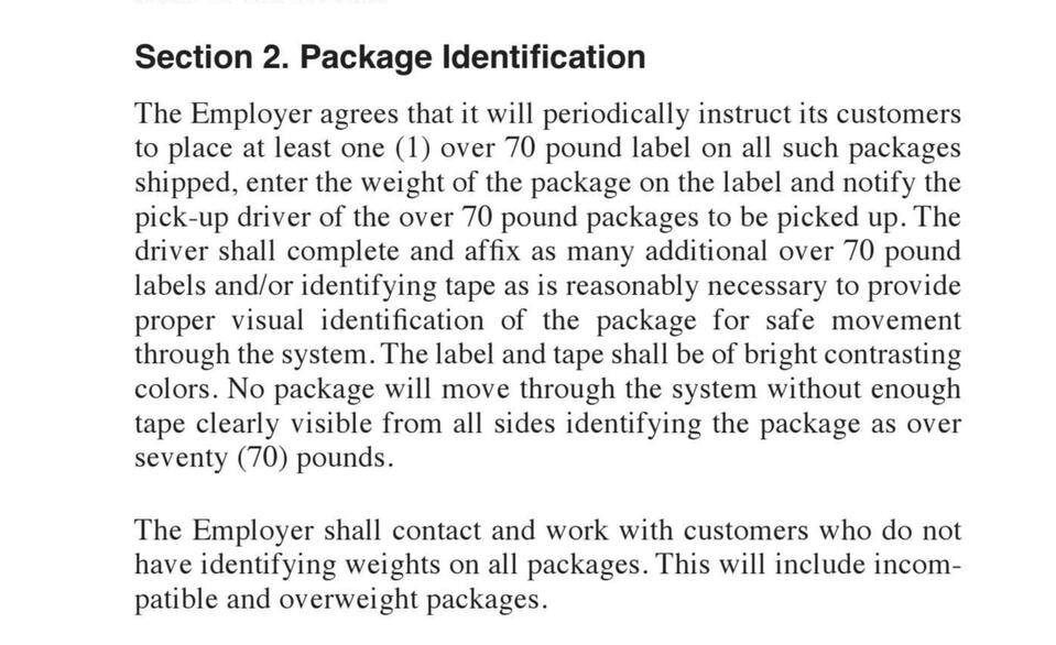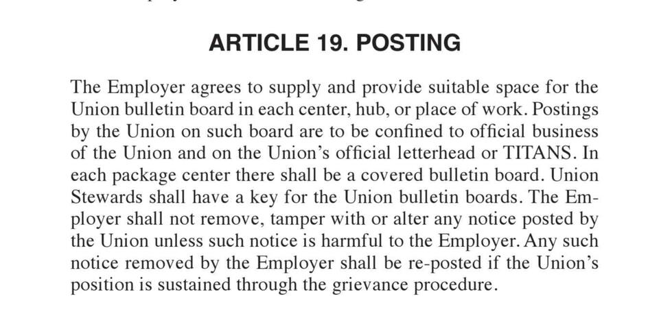 This section covers union operations, workplace conditions, employee rights, and management relations. It addresses supervision, discipline, paid time, technology, discrimination protections, and union activity. Guidelines for full-time and part-time employees, posting requirements, and package identification are included to ensure clear workplace policies and responsibilities for both employees and management.