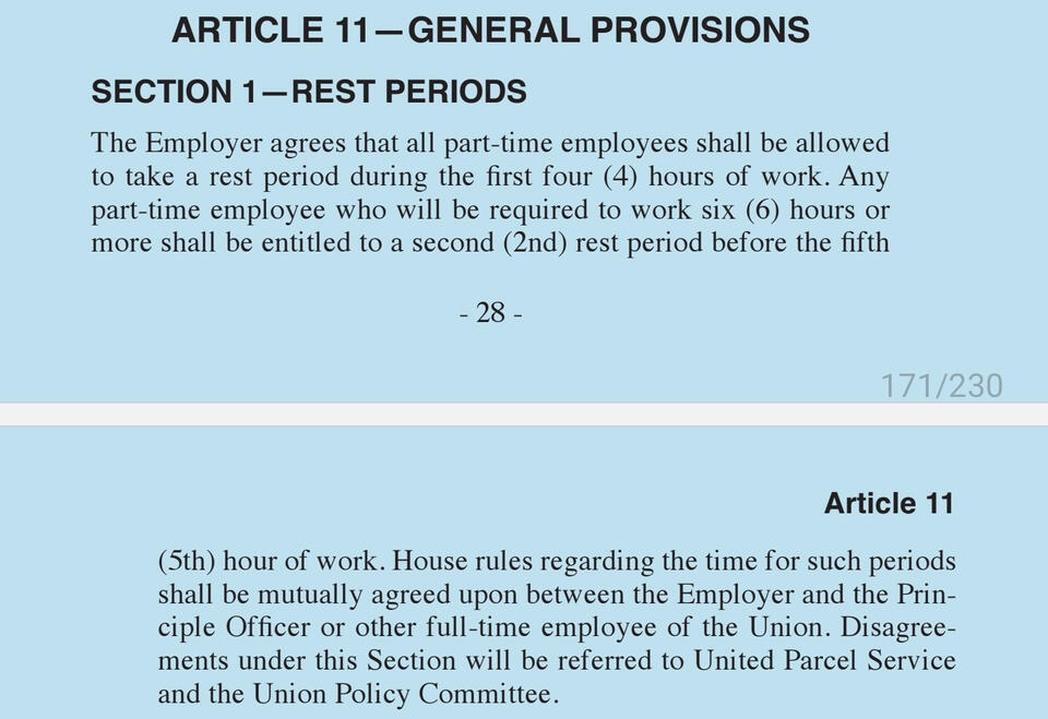 This section of the union agreement covers employee rights, seniority rules, grievance handling, workplace safety, job bidding, rest breaks, time clocks, and supervisor limitations. It outlines full-time work rules, wage progression, and overtime assignment while ensuring fair procedures for discipline, grievance resolution, and labor-management committee functions.