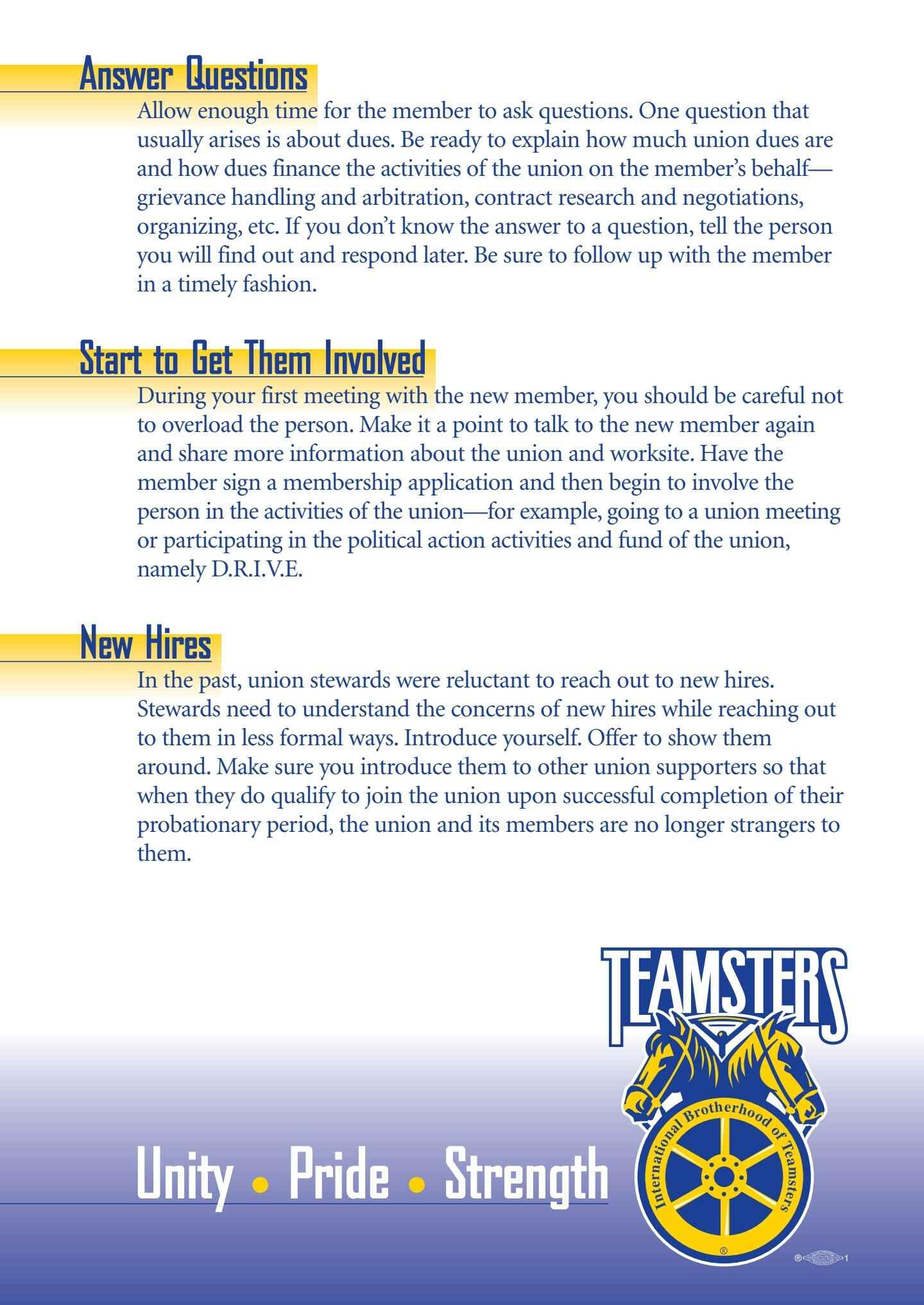 Steward's conduct must be professional at all times. Through preparation, performance and honesty, you will gain the respect of your members and management. Set a good example at the workplace. Do your job well and perform your steward duties with integrity. Throughout the grievance procedure, keep your members informed. Good communications builds trust.