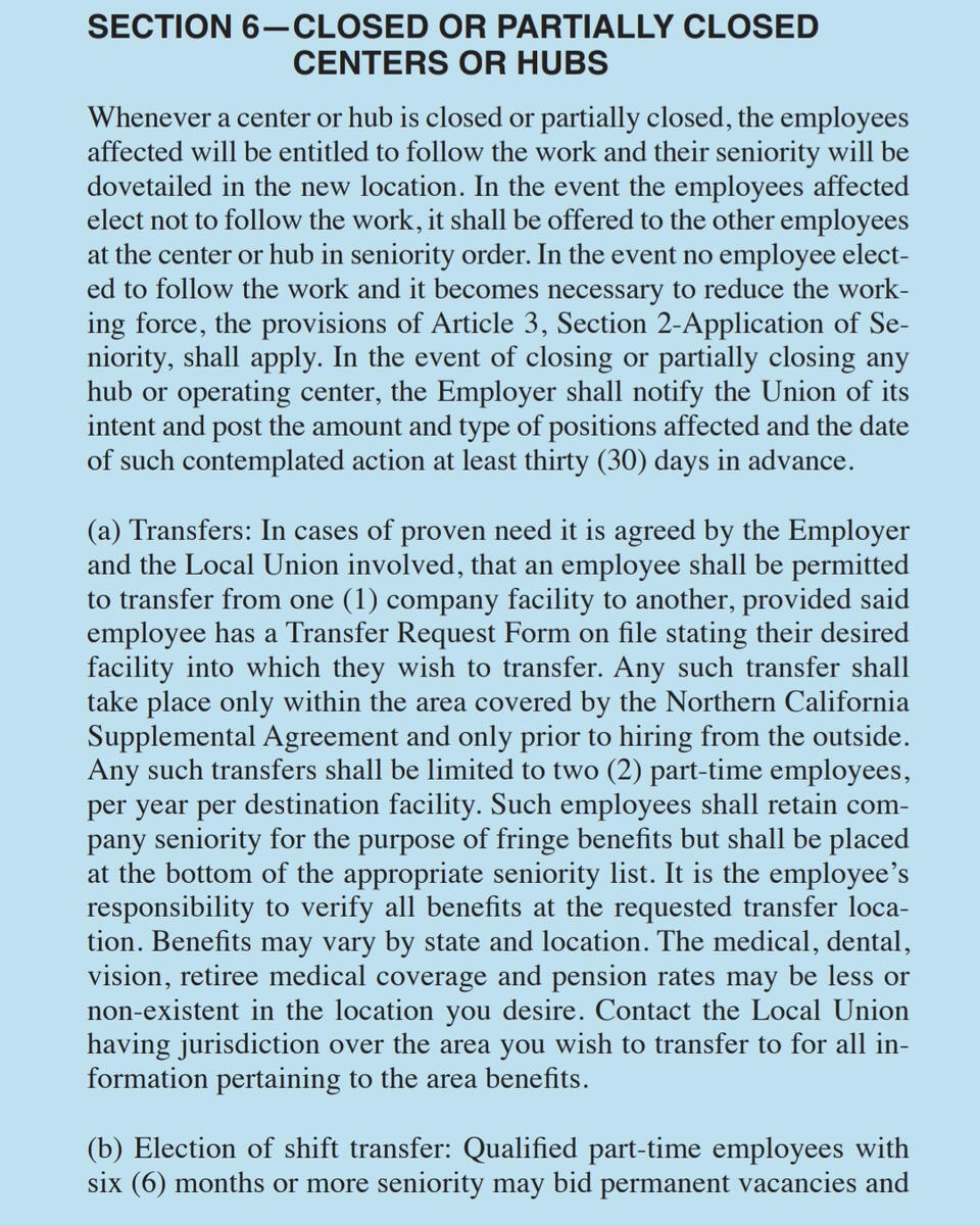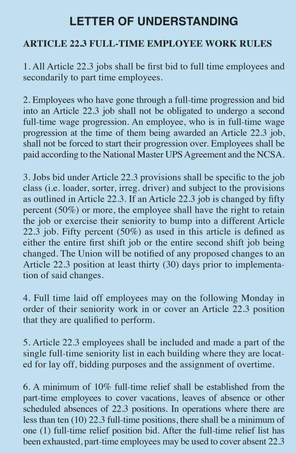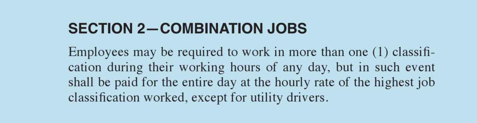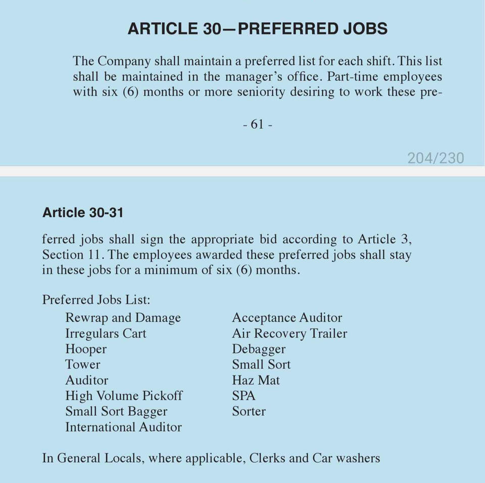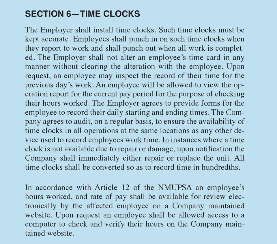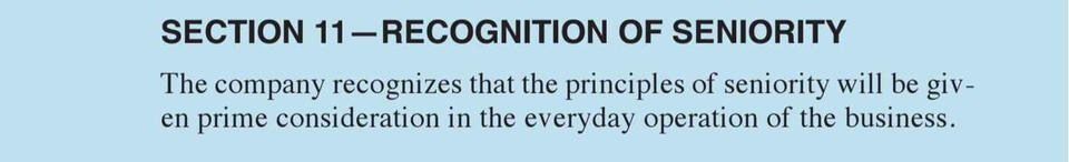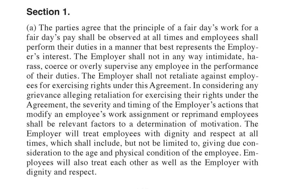 This section of the union agreement covers employee rights, seniority rules, grievance handling, workplace safety, job bidding, rest breaks, time clocks, and supervisor limitations. It outlines full-time work rules, wage progression, and overtime assignment while ensuring fair procedures for discipline, grievance resolution, and labor-management committee functions.