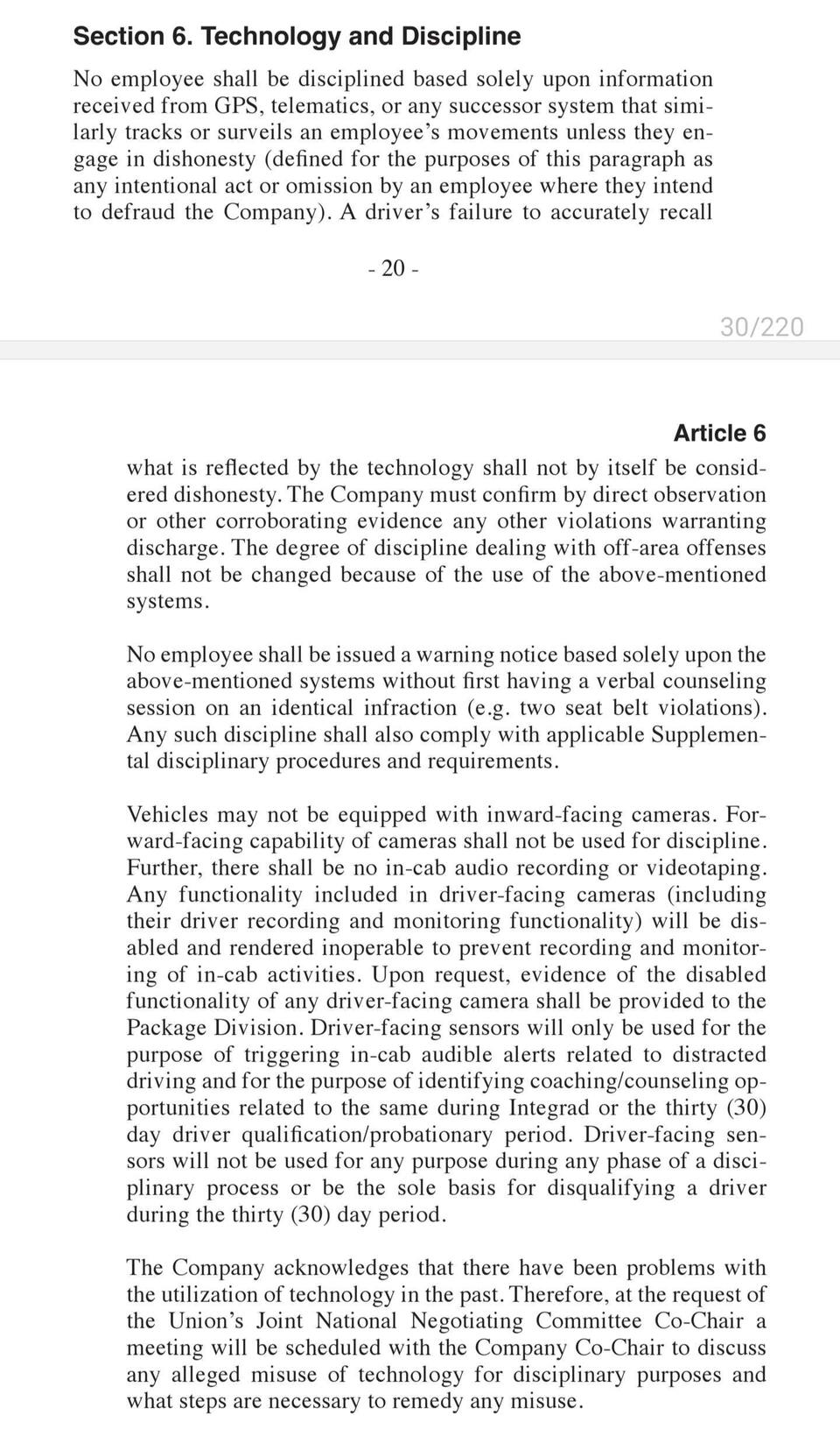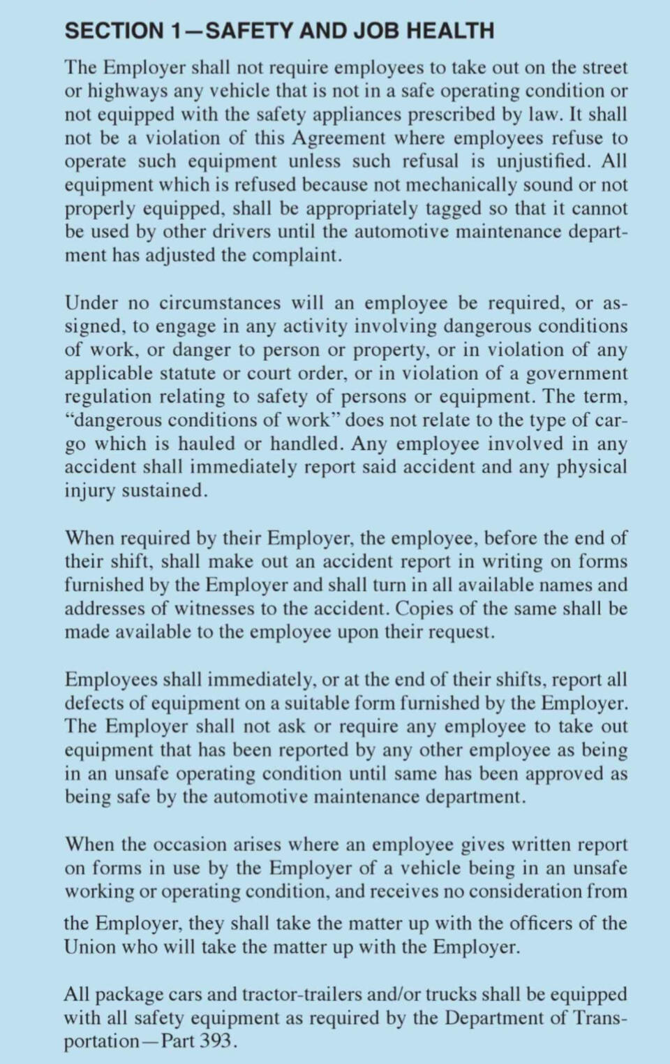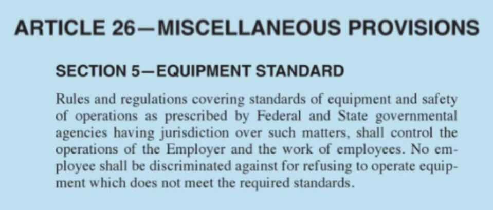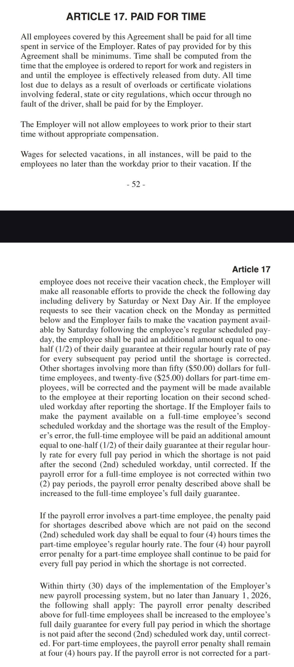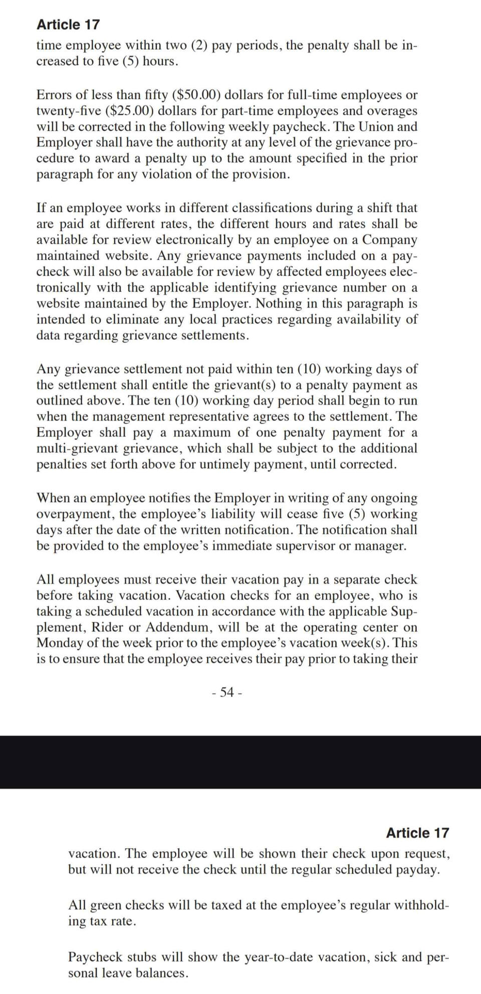 This section of the union agreement covers employee rights, seniority rules, grievance handling, workplace safety, job bidding, rest breaks, time clocks, and supervisor limitations. It outlines full-time work rules, wage progression, and overtime assignment while ensuring fair procedures for discipline, grievance resolution, and labor-management committee functions.